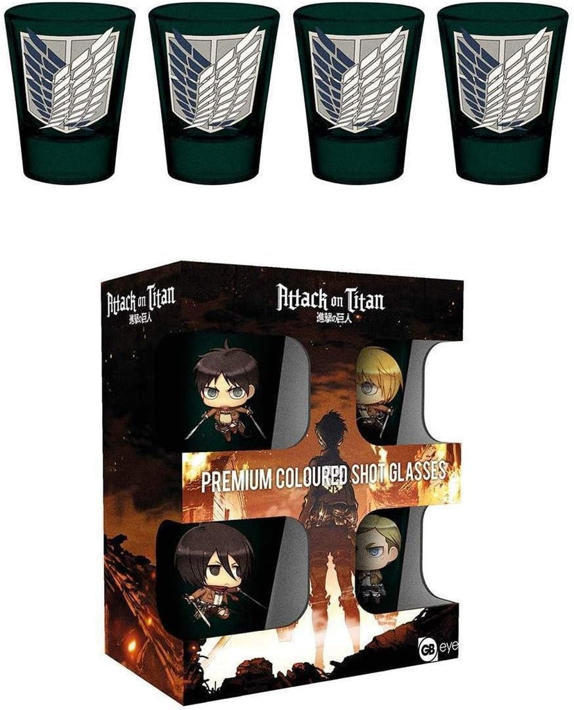 Set of four Official Attack on Titan shot glasses. These shot glasses are perfect for collectors and fans of the popular anime series.