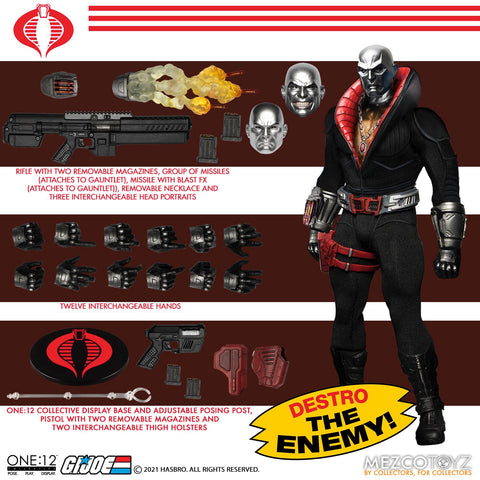 The One:12 Collective Destro is presented in his classic tactical outfit with tech enhancements, gauntlets with missile blasters, interchangeable thigh holsters, and combat boots. Destro features three masked head portraits, sporting his iconic beryllium steel mask and includes his necklace with amulet.
