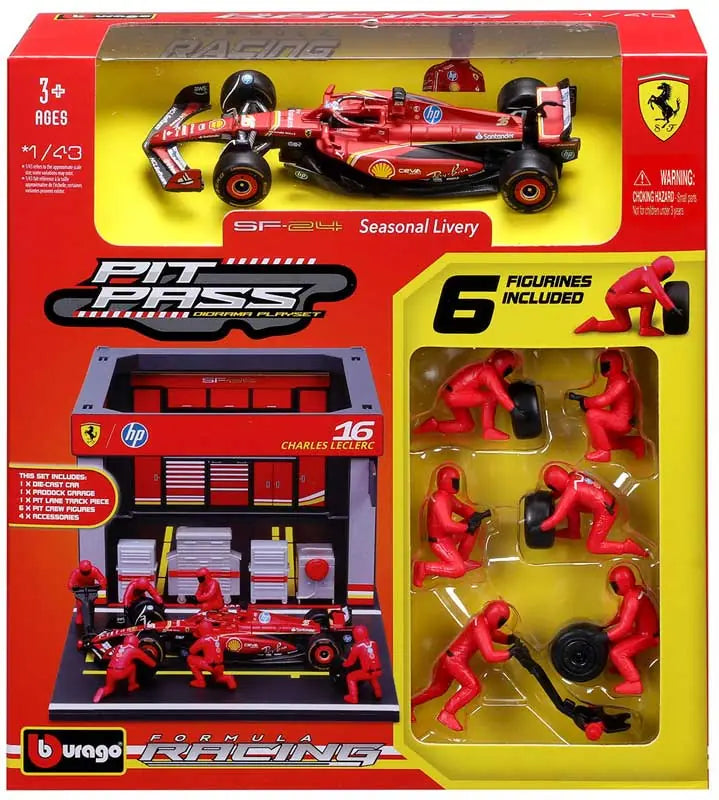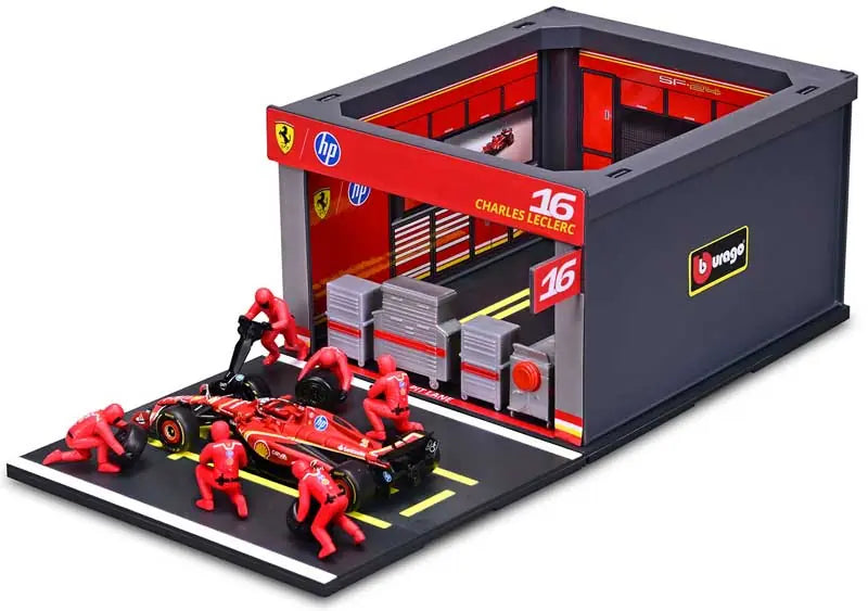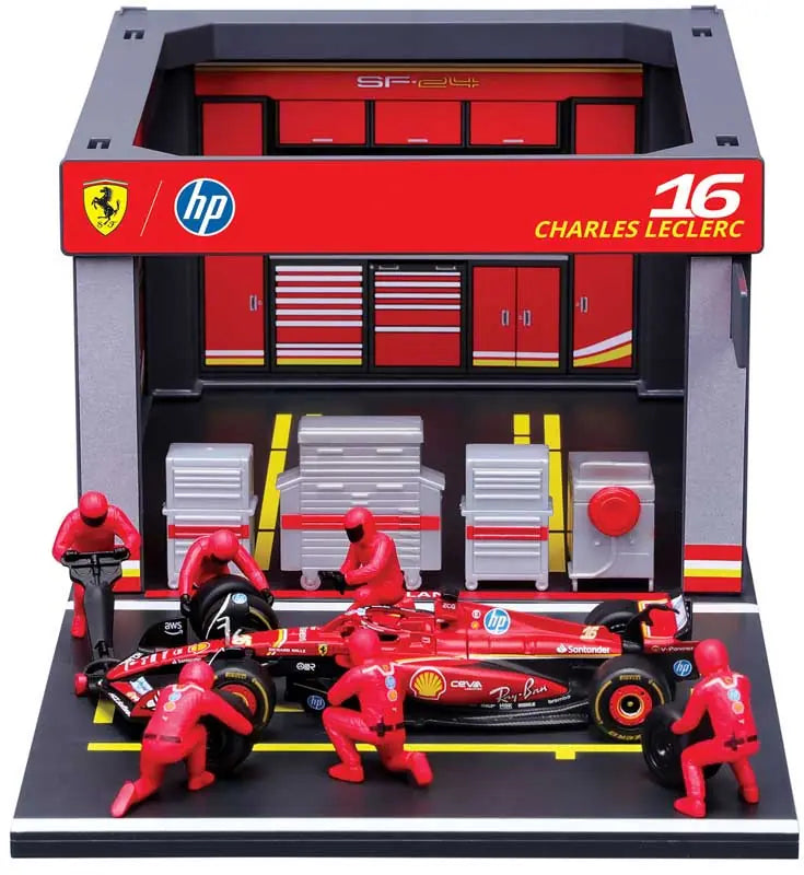 This 1:43 scale Ferrari SF-24 Pit Pass Diorama offers a detailed and dynamic representation of a Ferrari pit stop.
