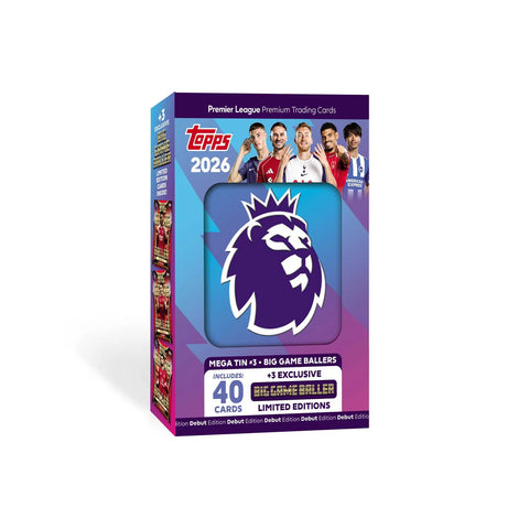 Topps are honoured to present Topps Premier League 2026 - Debut Edition. This innovative trading card collection brings fans closer than ever before to the heroes of the Premier League. Featuring an insane number of Autograph cards, rare sequentially numbered parallels, an incredible Rookie class with ultra-rare Diamond Rookie cards, special Chrome King Legends, mega-rare Premier Pull Limited Edition cards and the amazing Gold Lion cards, this collection is jam-packed with hits at every turn. With every Premier Leagure team represented, you can build your collection into something truly spectacular with all new subsets such as Generation Now, Full Force, Throwback Threads, Tekkers, Beast Mode and Pro Precision. Look out for genuine autograph cards from current players and Premier League legends including Haaland, Rooney, Bale, Son, Palmer, Torres, Van Dijk and many more across the complete collection of products. Each Mega Tin contains 40 cards plus 3 LE cards (Goal machines, Globallers, or Big Game Baller).